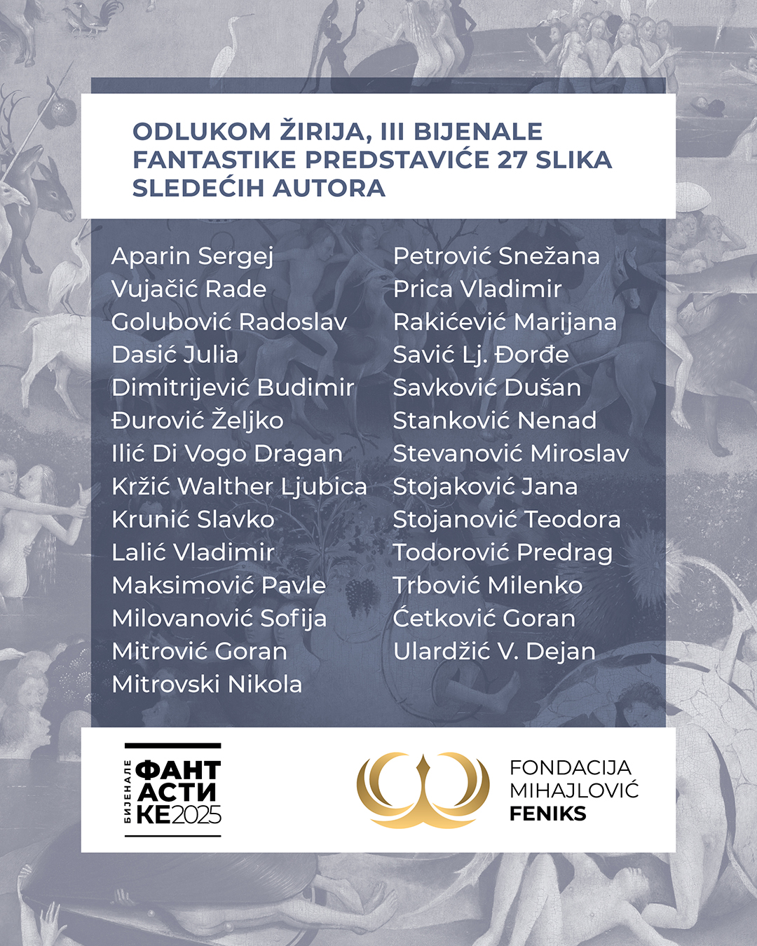 Žiri je selektovao 27 umetnika, čija će dela biti predstavljena na izložbi, a na svečanom otvaranju, zakazanom za subotu, 13. septembra u 18.30 časova, biće uručene tri nagrade, Gran-pri Bijenala fantastike, nagrada “Perspektiva” i nagrada za životno delo.