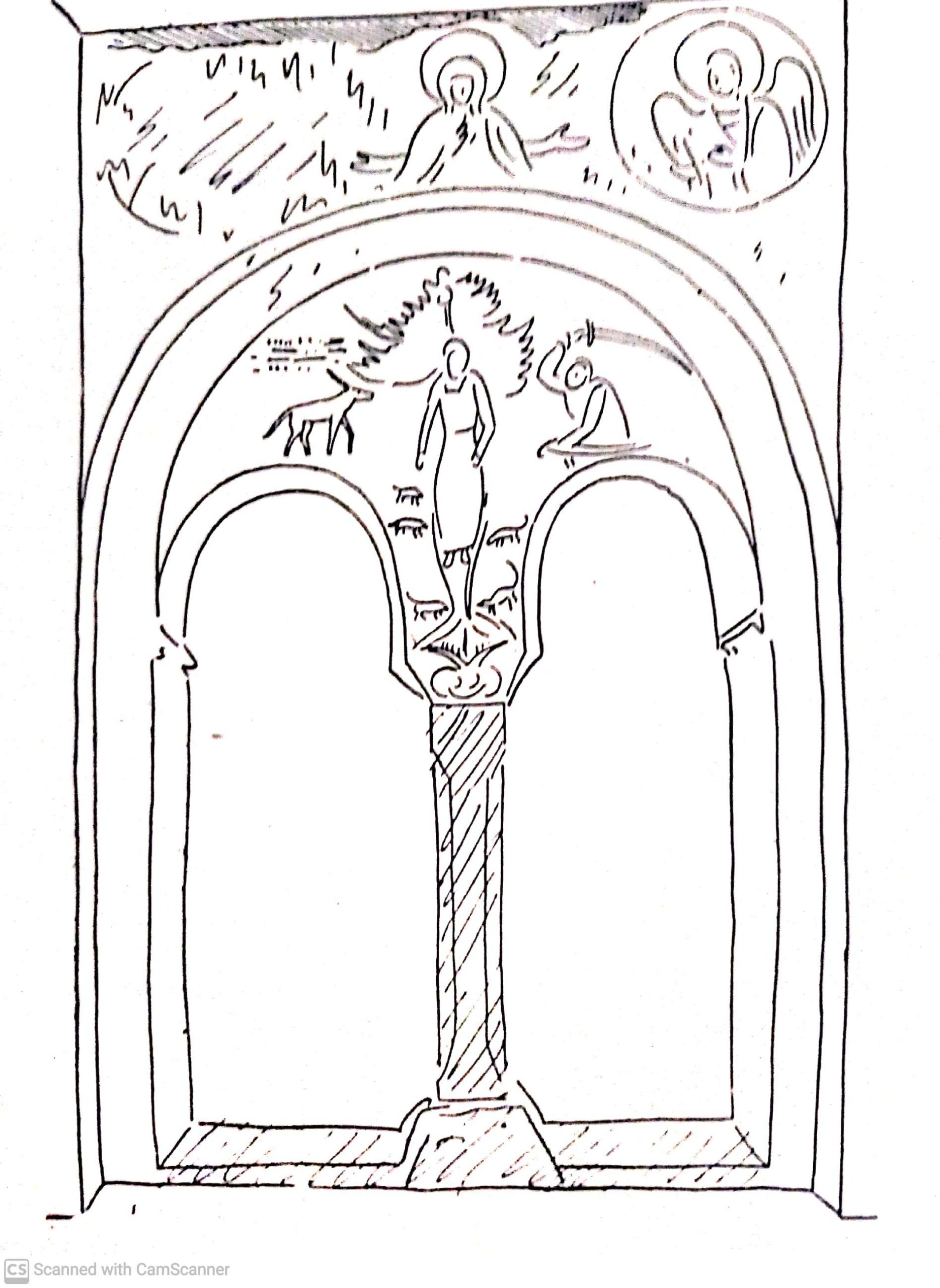 2. Crkva Bogorodice Ljeviške; zidno slikarstvo kule portika: Scena iz romana o Varlaamu i Joasafu (crtež). Preuzeto iz: B. Živković, Bogorodica Ljeviška, crteži fresaka.