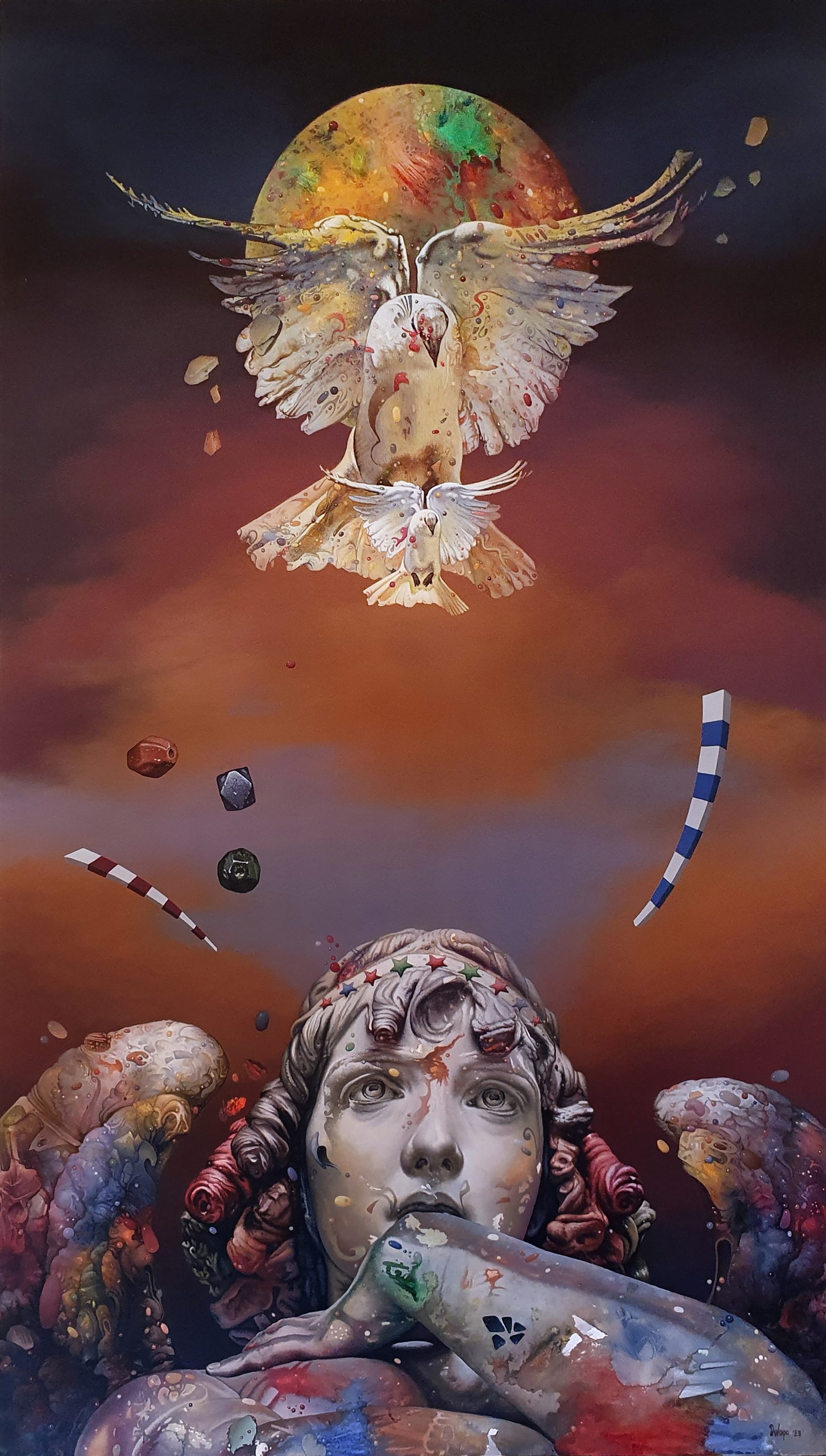 Etarske metamorfoze u snažnom pokretu, sa druge strane, poetski su ishod snoviđenja na slici „Jureći snove“ Sofije Milovanović (slika 13) što otvara temu snova u odnosu na umetnost fantastike. U tekstu „Fantastika kroz prizmu društvenog sanjanja“ za katalog Drugog bijenala fantastike 2023, Irina Tomić ukazuje na „san kao viši oblik postojanja“ (Tomić 2023: 6) koji, prema Platonu, predstaavlja ne-diskurzivno sredstvo saznanja (Satrobinski 1990: 93). Za Svetog Nikolaja Velimirovića biblijski primeri značajnih snoviđenja predstavljaju neretku i kontinuiranu pojavu: „ No primeri snova kao signala obilati su u naše dane isto kao i u drevne. Ko ima uši da čuje, neka čuje; i ko ima duhovni razum da razume, neka razume. Knjige bi se mogle napisati o snovima kao signalima, koji su javljeni samo u naše dane” (Velimirović 2016: 350). Može se na osnovu samog Nikolajevog pristupa naslutiti određeno mističko iskustvo na ovom planu, budući da je njegova pozicija „unutrašnja“ u odnosu na sadržaj izlaganja. Njegov kontemplativni duh kao da je posedovao neku vrstu „večne straže“ po ovom pitanju. Na činjenicu da umetnici fantastike slede sopstvene snove , sa druge strane, u tekstu „Figuracija fantastikom uzvraća udarac“ za katalog Prvog bijenala fantastike 2021 , Oliver Tomić ukazuje kao na potvrdu njihove umetničke autentičnosti (Tomić 2021: 8). Otkrivajući uzroke pojave Bijenala fantastike njegov inspirator Miroslav Mihajlović takođe navodi „da je sledio svoje snove“, ukazujući na okolnosti da se neki snovi ostvaruju a neki ne, ali da se u jednom duhovnom kontekstu između njih ne uočava razlika jer su, za njega snovi – bogatstvo po sebi (Mihajlović 2021: 4). U tome očigledno ima istomišljenika i nastavljača u sinu Mijatu Mihajloviću.